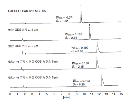 臭化ピナベリウムの特徴として構造の中にモルフォリンの4 級アンモニウムイオンを有することが挙げられます。そのため逆相モードの分析ではカラム表面の残存シラノールの影響を受けやすく、ピーク形状が崩れる傾向があります。ここでは、CAPCELL PAK C18 MGII S5、他社ODS カラム及び他社ハイブリッド型ODS カラムを用いて比較分析した結果を示します。ギ酸を用いた一般的な条件ですが、酸性条件下での強塩基性化合物分析に強みを持つMGII カラムの特徴がよく出た結果となりました。