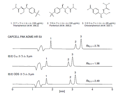 アンフェニコール系抗菌薬であるチアンフェニコール、フロルフェニコール、クロラムフェニコールをCAPCELL PAK ADME-HR S3 及び他社ODSカラム3 μm を用いて分析した結果を示します。ADMEカラムは他社カラムと比べて保持力も大きく、分離度も向上しました。