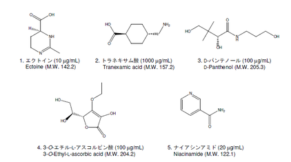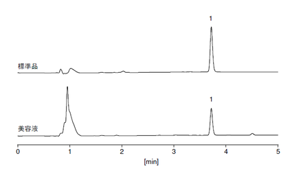 美容液に含まれるエクトイン、トラネキサム酸、D-パンテノール、3-O-エチル-L-アスコルビン酸及びナイアシンアミドをCAPCELL PAK SCX UG80 S5を用いたイオン交換モード及びCAPCELL PAK C18 KG S5を用いた逆相モードで分析した例を示します。