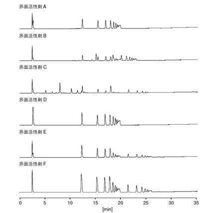 ここではポリオキシアルキル硫酸エステル塩A, B, C, D, E 及びF を分析し比較した例を示します。カラムにはCAPCELL PAK C18 MGII S5を用い、検出器にはユニバーサル検出器であるNQAD を利用して測定を行いました。