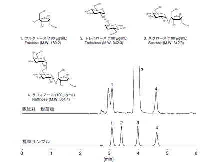 一般的な糖類であるフルクトース、トレハロース、スクロース及びラフィノースを親水性化合物の分析に有利なCAPCELL PAK ADME-HR S3を用いて逆相モードで分析した例を示します。ユニバーサル検出器の一つであるNQAD を用いると、UV 吸収をもたない糖類を前処理なしで簡便に分析することができます。また実試料への応用として、ラフィノースを比較的多く含むといわれている甜菜糖の分析も併せて行いました。その結果、主成分のスクロースとラフィノースのピークは十分に分離しており、ラフィノースの定量もこの条件を用いて実施可能であることがわかりました。