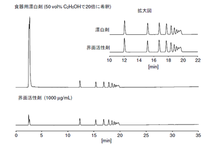 また実試料として食器用漂白剤を分析したところ、サンプルとプロファイルが完全に一致し、この界面活性剤が食器用漂白剤に含まれていることが明らかとなりました。