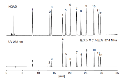 構造によって吸光度が大きく変化するUV検出器とは異なり、NQADは類似構造を持つ化合物に対して一律の応答性を示します。
