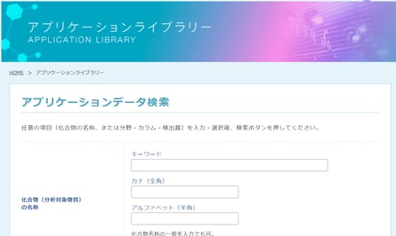 「化合物名」「分野」「カラム」「検出器」などからご要望のデータを検索いただけますので、ぜひご活用ください。